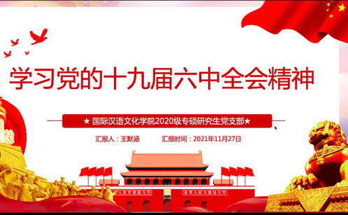 在“两个一百年”奋斗目标历史交汇的关键时期,为深刻领会党的十九届六中全会精神,h动漫 2020级专硕研究生党支部于2021年11月27日开展学习《中共中央关于党的百年奋斗重大成就和历史经验的决议》的主题党日活动,由党支部书记王默涵同志带头解读分享。支部全体党员积极参与本次活动,认真学习党的百年奋斗重大成就与历史经验。