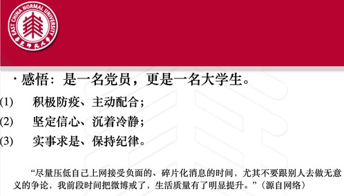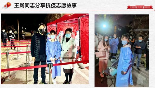 随后,王岚同志介绍了自己在白玉路学生公寓参与疫情防控、组织送餐的经历,并结合了党内相关规章制度和中共上海市委于4月6日发表的《致全市共产党员的公开信》,生动地展现了一个共产党员冲锋在前,甘于奉献的自我要求,她呼吁大家在抗疫关键时刻,要有党员的担当精神,要发出好声音、传播正能量,要懂得辨明是非,主动澄清各种噪音、杂音。