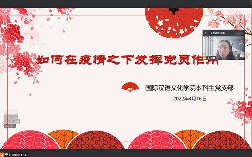 最后,支部书记刘曈进行总结发言,希望党员同学们共克时艰,迎难而上:一是调整心态,以积极乐观的态度面对这场“保卫战”;二是积极宣传引导,主动献言献策,营造理性的舆论氛围;三是乐于奉献,做好表率,关心周围同学的困难,成为志愿服务的主力军。