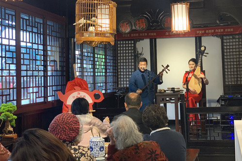 老街另一头的洪福桥畔“第一楼”里,上海评弹团正在进行“红色流动茶馆”的首场演出,我们有幸聆听了评弹团优秀曲艺演员们以评弹传唱红色故事,上了一堂别开生面的“非遗党课”。
