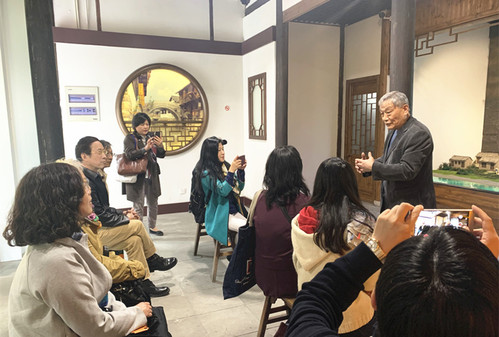 此次参访从位于新场大街的新场历史文化陈列馆开始,陈勤建教授早早就来到陈列馆,热情洋溢地为党员们介绍了新场的千年沿革,并从非遗专家的视角解析了新场作为“浦东最后一块文化遗产”的历史保护价值。谈起新场古镇迄今依旧活跃在民间的锣鼓书、浦东琵琶、江南丝竹、灶花、卖盐茶等国家级非物质文化遗产,陈教授娓娓道来,如数家珍,喜悦之情溢于言表,让我们感受到这位受人景仰的学者对于我国优秀民间艺术的拳拳挚爱。