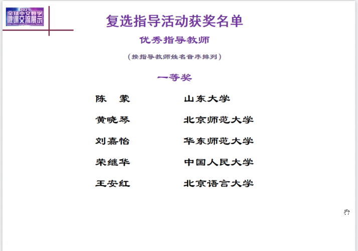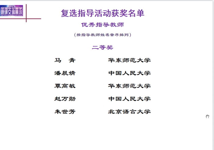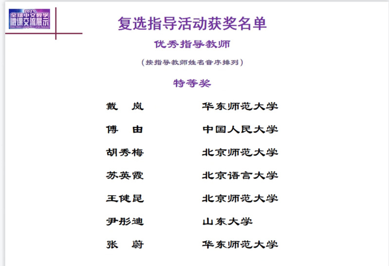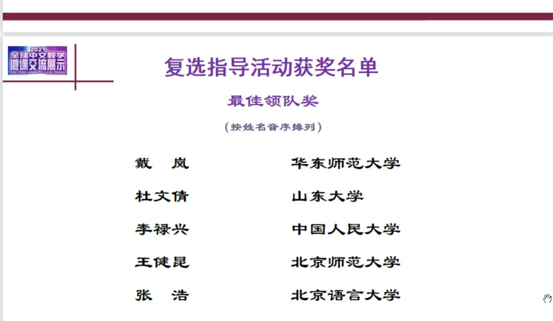 2022年4月22日上午,由中文联盟和北京语言大学出版社联合主办的“2021年全球中文教学微课交流展示”活动颁奖典礼暨复选导师制工作总结交流会在线上隆重举行。h动漫 国际汉语教师研修基地导师团队作为此次活动复选导师制环节甄选的国内五所高校之一,获得了优秀指导教师特等奖、一等奖、二等奖,戴岚老师获得了最佳领队奖。华东师大导师团队指导的十位选手也获得了优异的奖项,其中二等奖3名、三等奖3名、优秀奖4名,网络人气奖2名。在此祝贺所有获奖的选手和导师!