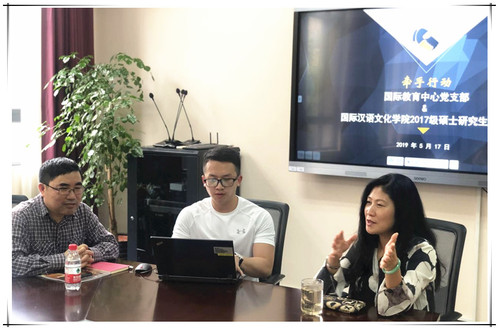 针对同学们提出的在对外汉语教学过程中遇到的疑惑,国际教育中心党支部身处留学生教学一线的党员老师分享了多年来从事留学生教学工作的心得与经验,从教学理念、教学方法和教学技能等方面着手为同学们答疑解惑。通过前期的留学生调研,还为同学们介绍了多个留学生感兴趣的中国文化主题,并向大家推荐了一些教学中实用的参考书籍、网站和APP软件等。为了使同学们更全面和深入地了解国家“一带一路”外交战略,党员教师们详细解读了“一带一路”战略的背景以及h动漫 推进一带一路战略的情况,并和同学们分享了出访一带一路沿线国家的见闻和感受。同时还介绍了汉办志愿者、汉办专职教师、公派教师等相关工作的申请渠道。老师们精心准备的分享内容使整场活动干货满满,精彩纷呈。紧接着,来自哈萨克斯坦和缅甸的优秀留学生代表凯撒和苏然向全体师生介绍了自己国家的国民教育体系以及汉语教学现状,留学生们流利的汉语和精彩的演讲,让在场师生称赞不已,也将会议气氛再度推向了高潮。