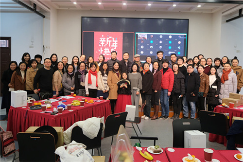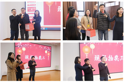 游戏以“合作”为主题,“团团圆圆”、“歌曲连连唱”、“东拼西凑”等环节轮番开展,显示集体的风貌,呈现团结的力量,为大家带来了无限欢乐。除了节目和游戏,联欢会还穿插了多次激动人心的线上线下抽奖环节,丰富、精美的礼品让大家期待不已。神秘大奖的诞生,将活动又一次推向高潮,承载着大家对美好生活的期盼。上半场的最后,所有老师走上舞台,一起拍摄了学院“全家福”。