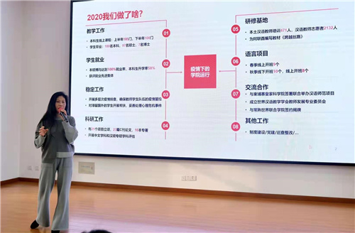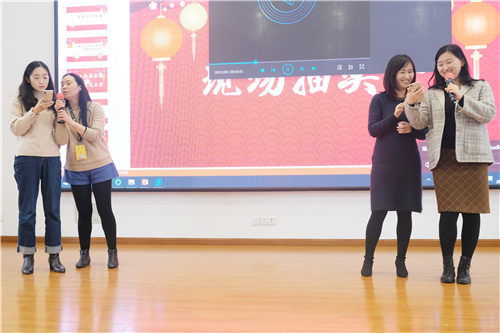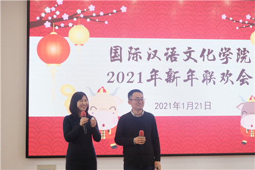 青年教师俞玮奇和辅导员吴春燕主持了联欢活动。吴晓隆和杨擎为大家带来的电影《无间道》天台对话片段的重新配词拉开了联欢会的帷幕。在与线上嘉宾的连线中,学院外派教师李宏祥从意大利都灵大学孔子学院发来祝福,衷心祝愿全院教师新年快乐,祝愿学院蒸蒸日上!王佳宁、刘曈、吴春燕、徐艾妮四位女老师组成“国汉女团”,将《最初的梦想》献给所有有梦想并为之努力的人们! 尚雅楠老师及其女儿李尚悦英文配音《后妈茶话会》,全场掌声不断。