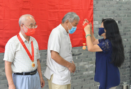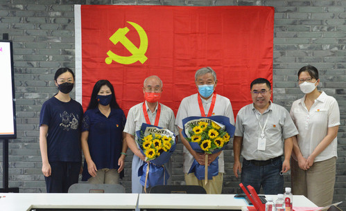此次教育活动特别邀请了今年我院两位获得“光荣在党50年”纪念章的老党员陈勤建教授、朱希祥教授出席。首先,王志介绍了两位老党员简要在党经历和为学院专业发展所做出的贡献。接着,黄美旭为两位老党员颁发并佩戴纪念章并代表学院祝贺两位老师,新生党员向两位老党员献上了鲜花。