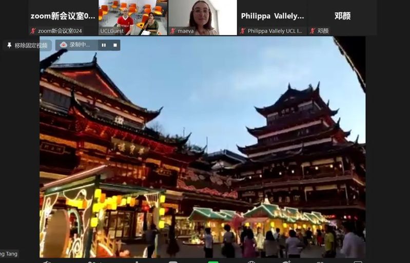 最有创意的当然是实境直播课!在语合中心的支持下,h动漫 国汉基地首创了线上沉浸式中文学习的新模式---实境直播,跳出以往的线上课程框架,打破电脑屏幕的限制,将教室搬入上海的大街小巷,在真正的交际中提高汉语的交流能力。本次IOE项目中,我们共开设了三场实境直播课,第一场实境直播团队带领学员游览了环球港,让学生体验了全新的无现金购物方式;第二场实境直播带领学员走进了豫园的景色和文化,传统的建筑、九曲十八弯的廊桥、嬉戏在睡莲之间的锦鲤;廊桥之上,可爱的孩子在父母身边玩耍,慈祥的老人在庭院中惬意乘凉,满眼好奇的游客穿梭在豫园的各个角落……,完美的园林式景观搭配最接地气的市民百态,形成了镜头中最经典的上海文化!与此同时,学员们还隔空与街头穿汉服的中国女生用汉语交流,身在英国的学员们和身在上海的中国女生都体验到了交流的快乐!第三场实境直播带领学员深度探访了外滩。尽管外滩已然是上海的经典代表地,然而对于从未来过中国的欧洲教师学员,一切都是那么新奇!学员不仅了解了外滩的建筑、和平饭店的前世今生、南京路的五彩斑斓,更在实境探访中练习了汉语,加深了互动与交流。