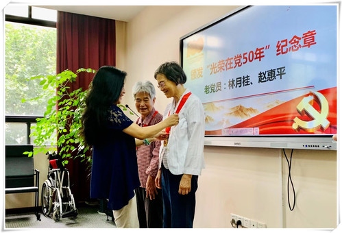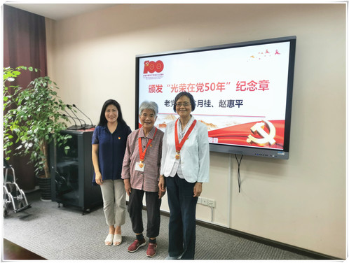 今年是伟大的中国共产党建党100周年,也是党中央首次颁发“光荣在党50年”纪念章,学院此次1956年入党的林月桂老师、1965年入党的赵惠平老师获此殊荣,学院党委书记黄美旭为两位老党员颁发并佩戴了“光荣在党50年”纪念章。