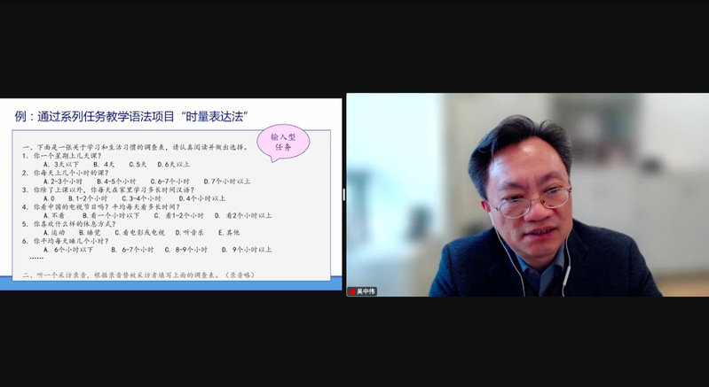 本次讲座一共分为三个部分。在第一部分“汉语语法特点及其启示”中,吴中伟教授首先和大家一起回顾了汉语语法“没有严格意义上的形态变化、词类和句法成分不一一对应、语序和虚词非常重要”这三种特点,并在此基础上提出了汉语语法的第四种特点,即:“汉语是‘语用强势语言’”这一独特见解。然后从语法的三个维度“句法、语义、语用”出发,和大家讨论了汉语语法特点对我们进行汉语教学的重要意义。在第二部分“汉语语法的显性教学”和第三部分“汉语语法的隐性教学”中,吴中伟教师通过大量的教学实例,和大家分别讲述了在“显性教学”中教师应该如何确定阶段性教学目标、教学重点和内容载体,以及在“隐性教学”中教师应该如何开展词汇化教学,并以任务驱动式课堂活动促进学生的伴随性学习。讲座最后,吴中伟教师还和参与本次讲座的美国本土教师学员进行了交流互动,详细回答了学员提出的诸如“如何给美国高中生讲‘了’这个语法点”等问题。