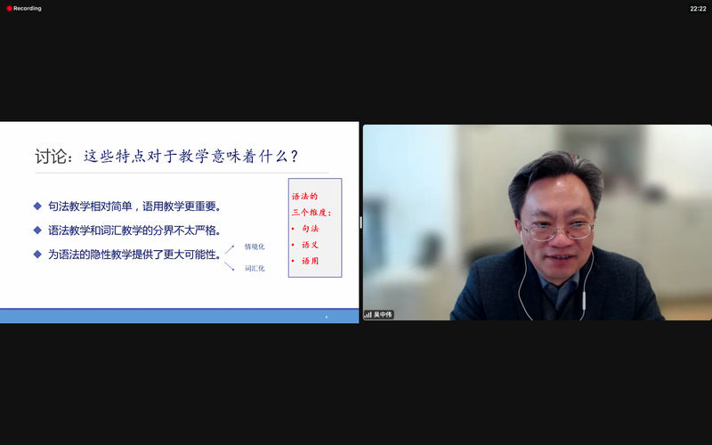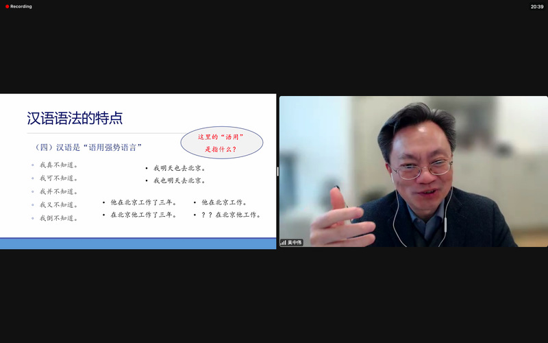 北京时间2023312日上午9点,我们邀请到复旦大学国际文化交流学院前院长、世界汉语教学学会理事吴中伟教授,为我院国际汉语教师研修基地与美国芝加哥大学孔子学院合作的K-12本土教师培训项目做了题为汉语语法教学途径和策略的线上讲座。